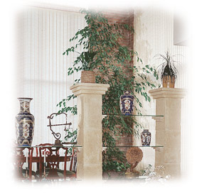 With hundreds of styles to choose from, vertical blinds transcend the ordinary because they are distinctive, classic and long-lasting. Our selections include fashionable smooth and textured vinyls, as well as fabrics ranging from basic non-wovens to decorative weaves and jacquards. No other treatment offers the unique combination of fashion, form and function like vertical blinds. Just to mention a few manufactures for vertical blinds that we carry are: Kathy Ireland, Skandia Window Fashion, and Century.